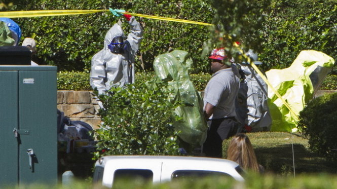 Nhân viên y tế Mỹ mặc đồ bảo hộ vào làm sạch căn hộ của nữ y tá Amber Vinson bị nhiễm virút Ebola ở Dallas - Ảnh: Reuters