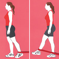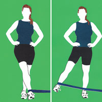 Để dải bang chun được neo đằng sau bạn và vòng xung quanh mắt cá chân trái, bàn chân uốn cong. Đưa chân trái về phía trước khoảng 12 phân, giữ nó thẳng, và quay trở lại tư thế bắt đầu. Làm tương tự với chân phải.