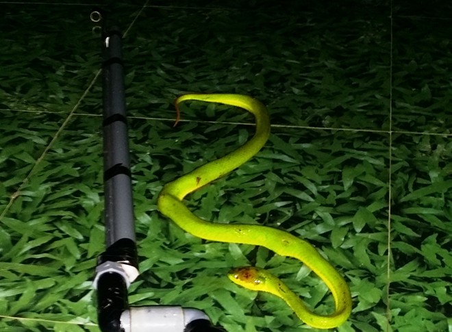 “Nửa đêm 15/10, vừa bước ra hiên nhà tôi giật mình khi thấy con rắn lục bám vào cột ở hiên nhà. Sau phút hoảng sợ, tôi lấy gậy đập chết con rắn rồi đem vứt", bà kể lại và khẳng định, từ đầu tháng 9, người trong gia đình bà đã 4 lần rơi vào tình huống tương tự.