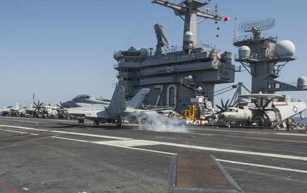 Máy bay F/A-18 Super Hornet đáp xuống tàu sân bay USS Carl Vinson (CVN 70) ngày 19.10 sau khi ném bom phiến quân IS ở Syria. Tàu sân bay Carl Vinson đến vùng Vịnh thay thế tàu sân bay USS George H.W. Bush trong chiến dịch tiêu diệt phiến quân IS - Ảnh: Hải quân Mỹ