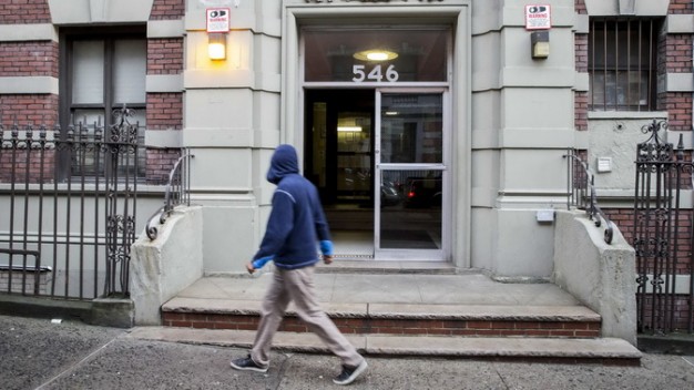 Một người đàn ông đi ngang tòa nhà nơi bác sĩ Craig Spencer sinh sống ở Manhattan, New York - Ảnh: Reuters