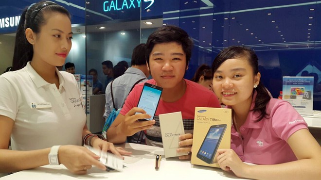 Một trong những khách hàng mua Galaxy Note 4 được tặng thêm Galaxy Tab. Ảnh: Minh Trung.