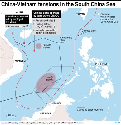Bản đồ Biển Đông với đường lưỡi bò do TQ đơn phương công bố nhằm chiếm trọn Biển Đông, vị trí dàn khoan HD 981 và dàn khoan thứ hai do TQ thiết lập hồi tháng 6 năm 2014. |