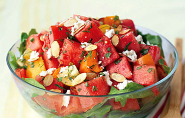 1. Trộn dưa hấu và cà chua (cả 2 đều đã thái hạt lựu) vào trong một chiếc bát lớn. Trộn đều và nhẹ. Cho muối và đợi khoảng 5-10 phút