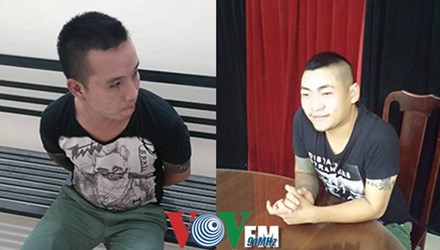 Đối tượng Quân (trái) và Hùng Anh "hớn hở" tại trụ sở công an phường.