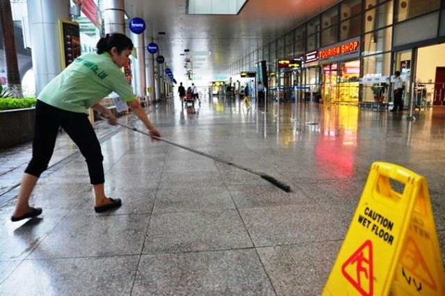 Ghi nhận tại hiện trường cho thấy, Công ty vệ sinh Nhà xanh huy động nhiều nhân viên với nhiều thiết bị đang cố gắng lau chùi, dọn dẹp những phần nước bị dột từ mái xuống sàn nhà, đồng thời bố trí nhiều bảng cảnh báo trượt té để hành khách biết và tránh.