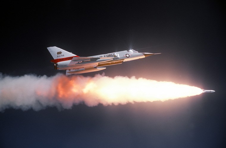 Chính v́ lẽ đó, người Mỹ bắt đầu tính tới phương án phát triển vũ khí không đối không trang bị đầu đạn hạt nhân. Với sức công phá của loại đầu đạn này sẽ khắc phục được độ chính xác cũng như bán kính sát thương mục tiêu, đảm bảo chống lại cuộc tập kích đường không quy mô bằng máy bay ném bom. Đó là cơ sở cho sự ra đời của tên lửa không đối không tầm ngắn mang đầu đạn hạt nhân AIR-2 Genie. Trong ảnh, máy bay tiêm kích F-106 của Không quân Vệ binh Quốc gia California bắn thử nghiệm AIR-2 Genie.