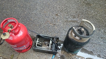 Các bình gas được đưa ra ngoài để đưa đi giám định.