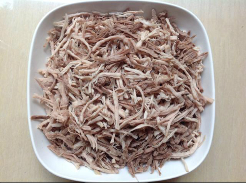 Sau đó, cho lại thịt đã xé vào nồi nước luộc, trộn đều với gia vị. Đun nhỏ lửa cho đến khi cạn nước.
