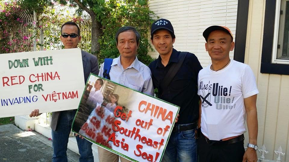 Nói về biểu tình ở California, mình kể thêm một chút kỷ niệm. Tói hôm sau, Minh đưa mình đi có việc. Đột nhiên, anh dừng xe lại, bảo vào đây cái đã. Thì ra ở đấy, cũng có một cuộc mít tinh chống Trung Cộng. Minh bảo đừng nói gì nhé, cứ quan sát thôi (như đã nói, Minh luôn luôn tìm cách bảo vệ mình). Đó là một khoảng vỉa hè nhưng rất rộng, trên tường căng một phông lớn. Cũng cờ vàng, biểu ngữ và hô khẩu hiệu đả đảo cả Trung Cộng lẫn Việt Cộng. Mình đứng quan sát được một lúc thì đồng bào lần lượt kéo đến vây quanh hỏi chuyện.
