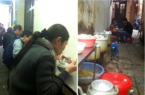 Để tiết kiệm chi phí, con ngõ rộng chỉ 1 m, dài hơn 20 m trên mặt phố gần ngã tư Hàng Lược - Hàng Khoai 30 năm nay được mấy chị em chủ quán tận dụng bán bún, miến mọc. Quán mở từ sáng sớm tới khoảng 10h trưa, luôn đông kín khách mỗi ngày. Vào giờ cao điểm, khách ngồi tràn ra cả đoạn vỉa hè trước cửa và vỉa hè đối diện bên đường. Nhiều thực khách thậm chí phải đứng chờ để có chỗ ngồi. Tuy quán nhỏ hẹp nhưng do số lượng khách ăn mỗi ngày quá đông nên chủ quán phải huy động tới gần chục người phục vụ.