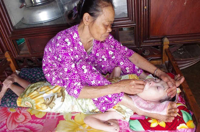 Nói về Chi, bà rơm rớm nước mắt cho hay, cô bị bại não do nhiễm chất độc màu da cam, từ bé đã không thể nói cười, nhận thức được như bao đứa trẻ khác, tay chân bị teo tóp co quắp. Ngày ngày bà phải ở bên để chăm sóc con từ việc cho ăn đến vệ sinh thân thể.