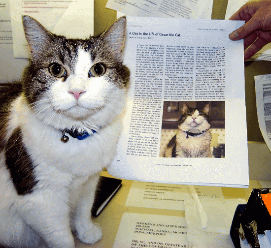 Oscar bên cạnh một bài báo viết về khả năng đặc biệt của chú mèo.