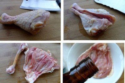 Lóc bỏ xương gà, dàn gà ra thớt rồi rắc ít muối, tiêu và rượu lên.
