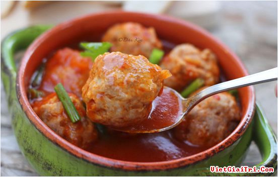 - Tiếp tục phi thơm dầu với hành hương. Sau đó cho tương cà, cà chua vào xào chin mềm thì cho súp gà hoặc nước lọc vào. Đun sôi rồi nêm gia vị vừa ăn. Tiếp đến cho thịt viên vào đun khoảng 10 phút là được. Nếu muốn nước sốt hơi sánh, bạn cho vào ít bột năng hòa tan.