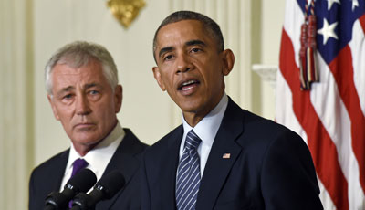 Đứng cùng với Hagel, Tổng Thống Obama nói rằng hai người nhận định rằng “đây là thời điểm thích đáng để bộ trưởng quốc phòng kết thúc nhiệm vụ.”