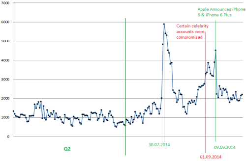 Bên cạnh đó, các chuyên gia cũng đă phát hiện thấy một số kiểu lừa đảo gia tăng nhanh chóng có liên quan đến sự ra mắt các sản phẩm mới của Apple như MacBook mới (cuối tháng 7) và iPhone 6 (đầu tháng 9). Năm ngoái, các chuyên gia Kaspersky Lab cũng có những phát hiện tương tự vào ngày ra mắt sản phẩm mới của Apple.
