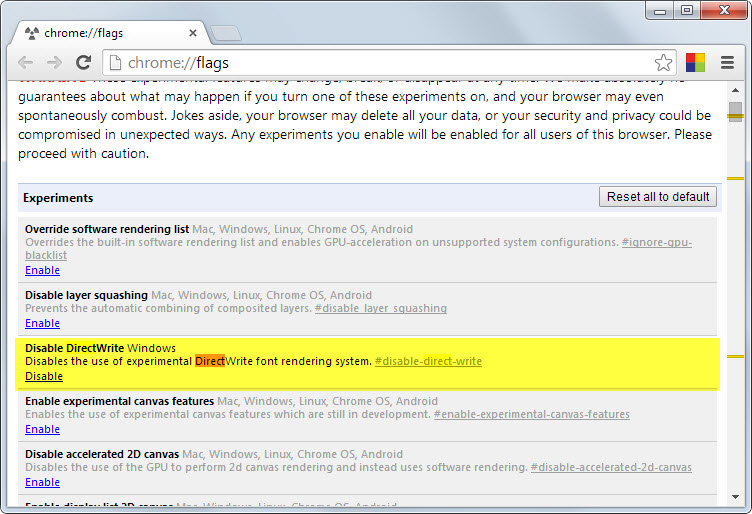 - Nhấn tổ hợp phím Ctrl+F (hoặc Ctrl+G) để mở thanh tìm kiếm và nhập vào từ khóa “DirectWrite”. Ở kết quả tìm kiếm, bạn tìm đến dòng “Disable DirectWrite Windows” rồi nhấn vào “Enable” phía bên dưới.