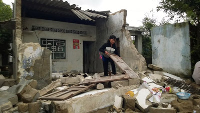 Bà Nguyễn Thị Lệ Thủy (45 tuổi, thôn Bình Thái, xã Phước Thuận, huyện Tuy Phước (Bình Định) đang dọn dẹp căn nhà vừa bị sập trong bão số 4. (Hình: Tuổi Trẻ)