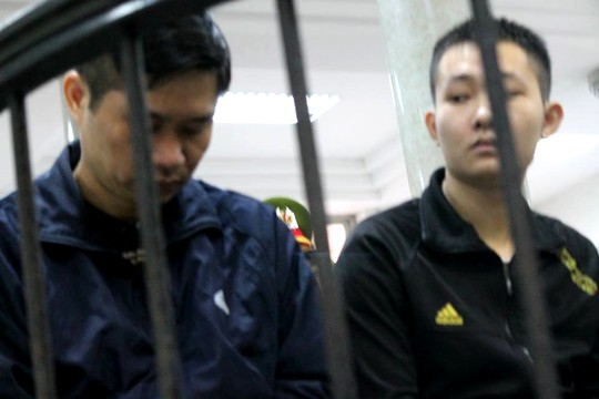 Nguyễn Mạnh Tường (trái) cúi mặt sau vàng móng ngựa cùng bảo vệ Đào Quang Khánh (phải)