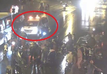 Tối 3/12, người dân trên phố Lê Duẩn (Hà Nội) đã chặn xe cứu thương của tài xế Khánh (vòng tròn đỏ) để yêu cầu chở anh Hiếu đang bị tai nạn nguy kịch đến bệnh viện cấp cứu. Nhưng tài xế Khánh đã từ chối. Ảnh: Otofun.