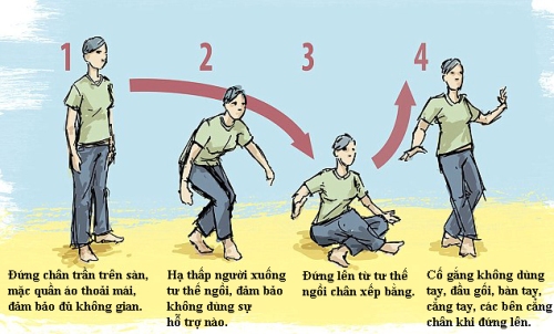 - Đứng lên mà không sử dụng bàn tay, đầu gối hay cẳng tay, hai bên cẳng chân để đẩy người.