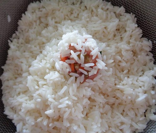 Bước 4: Viên từng viên thịt nho nhỏ lại. Rồi lăn từng viên thịt qua gạo nếp cho gạo bám xung quanh viên thịt.