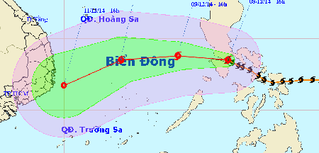 Dự báo trong 24 giờ tới, bão di chuyển chủ yếu theo hướng Tây Tây Bắc, mỗi giờ đi được khoảng 10-15km. Như vậy khoảng sáng sớm ngày mai (9/12) bão sẽ đi vào khu vực phía Đông biển Đông. Đến 16 giờ ngày 9/12, vị trí tâm bão ở vào khoảng 13,8 độ Vĩ Bắc; 118,0 độ Kinh Đông, trên khu vực phía Đông biển Đông, cách đảo Song Tử Tây (thuộc quần đảo Trường Sa) khoảng 490km về phía Đông Đông Bắc. Sức gió mạnh nhất ở vùng gần tâm bão mạnh cấp 9 (tức là từ 75 đến 88 km một giờ), giật cấp 10 - 11. Do ảnh hưởng của bão kết hợp với không khí lạnh, từ tối nay ở khu vực phía Đông biển Đông có gió mạnh cấp 6, sau tăng lên cấp 7, vùng gần tâm bão đi qua mạnh cấp 8 - 9, giật cấp 10 - 11. Biển động rất mạnh.