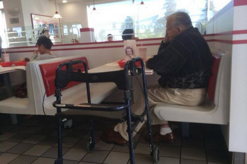 Bức ảnh chụp một người đàn ông lớn tuổi ngồi ăn với di ảnh của vợ hồi tháng 10 được người dân ở khu vực vịnh San Francisco, bang California, Mỹ, chia sẻ với sự xúc động và tình cảm yêu mến. Người chồng luôn mang theo hình vợ đi khắp nơi và thường đặt nó trước mặt mỗi khi ăn.