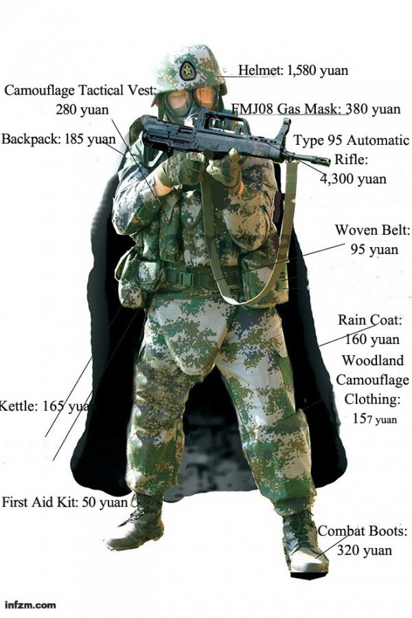Tác giả bài báo trên viết: phương tiện chiến đấu của một lính TQ có giá tương đương “2 chiếc iPhone 6 cấp độ 2”, trong khi phương tiện chiến đấu của lính Mỹ cao giá hơn gấp 10 lần, tương đương “một ô-tô cấp trung bình”.