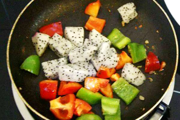 Mách nhỏ: Nên cho thanh long vào sau, xào trên lửa lớn để thanh long không nhũn và trở vị chua.