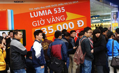 Mọi người xếp hàng bên ngoài một cửa hàng điện thoại Nokia ở Hà Nội để mua điện thoại giảm giá vào ngày 03 tháng 12 năm 2014. AFP photo