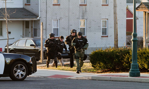 Cảnh sát canh gác phía ngoài tòa nhà nghi là nơi Stone đang ẩn náu ở Pennsburg, Pennysylvania