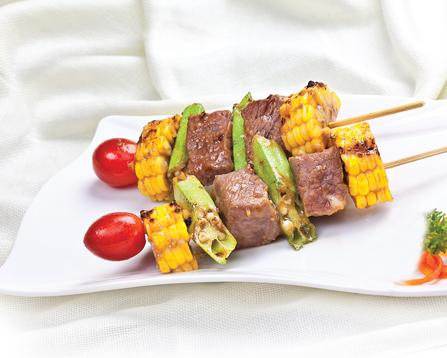 - Xếp xiên thịt bò nướng mù tạt ra dĩa, xiên thêm cà chua bi, khi ăn chấm với Xốt Mayonnaise trộn.