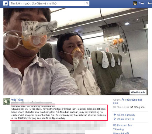 "Máy bay giảm áp đột ngột, hành khách phải đeo mặt nạ dưỡng khí. Để đảm bảo an toàn, máy bay đã không hạ cánh ở Vinh mà phải hạ cánh ở Nội Bài. Sau khi máy bay hạ cánh vào khu vực quân sự ở Nội Bài thì lực lượng an ninh đã cô lập máy bay" - theo Facebook Việt Thắng, hành khách đi trên chuyến bay.