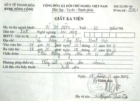 Trong giấy ra viện thì bà Kiên phải nằm viện điều trị 4 ngày với chẩn đoán chấn thương vùng đầu do bị đánh, điều trị bằng kháng sinh, giảm đau, uống vitamin.
