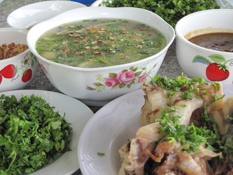 Mẹ chồng chị dặn ngoài xóm, lựa mấy con cá lóc loại trên một ký mỗi con, xớ thịt dẽ khắc. Tất cả đều rỉa nhỏ trừ cái đầu và bộ đồ lòng. Có lẽ là dân ven biển nên cháo luôn có mực tươi và tôm khô. Khi cháo nhừ, việc dọn bàn khá công phu vì để cho tô cháo ám đúng khẩu vị của gia đình, phải có một chén nước mắm trong, một chén gừng xắt nhuyễn, một chén mắm tôm, một dĩa chanh, ớt; một chén ngò rí, một dĩa hành hương - loại hành cọng nhỏ xíu - thơm mùi đặc trưng, một chén tương xay, một dĩa đậu phộng…