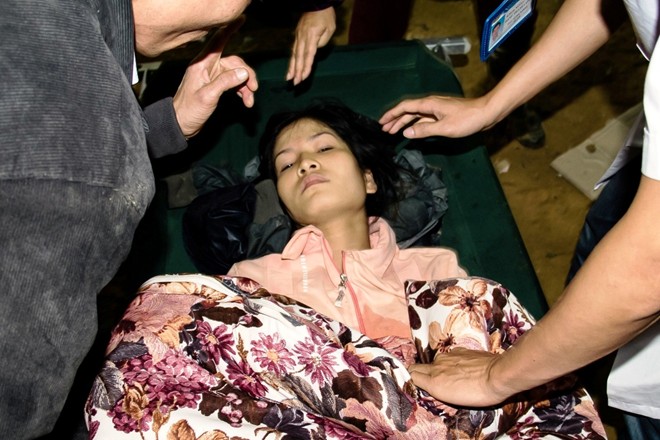Nữ công nhân Đặng Thị Hồng Ngọc vào thời điểm được đưa ra khỏi hầm thuỷ điện.
