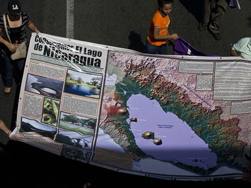 Người biểu tình hôm 10-12 mang theo bản đồ Hồ Nicaragua trong cuộc tuần hành khổng lồ chống lại dự án gây dựng kênh đào Nicaragua. Ảnh: AP