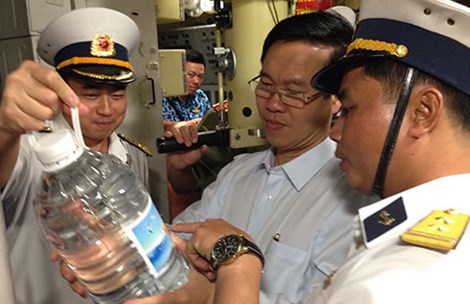 Trung tá Nguyễn Văn Bách, thuyền trưởng tàu ngầm HQ-183 TP.HCM (phải), tặng ông Võ Văn Thưởng, Phó Bí thư Thường trực TP.HCM, chai nước biển lấy từ độ sâu 285 m.