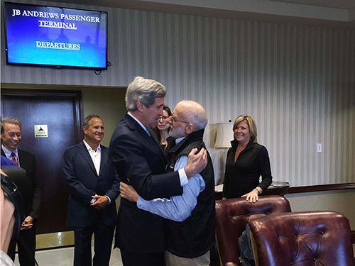 Ngoại trưởng Mỹ John Kerry (trái) chào mừng công dân Mỹ Alan Gross hồi hương sau 5 năm bị giam ở Cuba Ảnh: Reuters