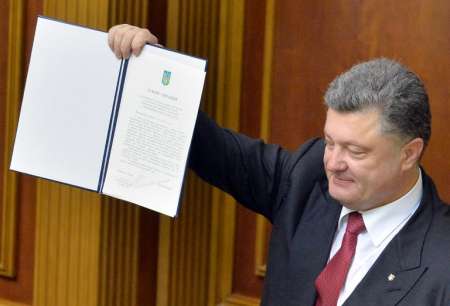 Tổng thống Ukraina Petro Poroshenko với bản Hiệp định liên kết với EU trong phiên họp quốc hội tại thủ đô Kiev ngày 16/9