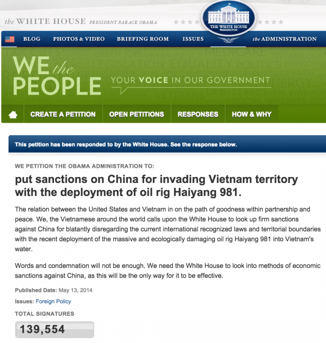 Trước đó hồi tháng 5/2014, một bản kiến nghị Mỹ trừng phạt Trung Quốc vì đã hạ đặt trái phép giàn khoan Hải Dương-981 trong vùng đặc quyền kinh tế của Việt Nam trên Biển Đông đã được đăng tải trên trang web của Nhà Trắng. Đơn kiến nghị trừng phạt Trung Quốc đã thu hút gần 140.000 người ký tên