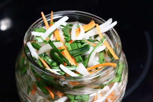 - Xếp hỗn hợp giá và hẹ vào hủ thủy tinh sạch, chế hỗn hợp nước giấm pha vào.