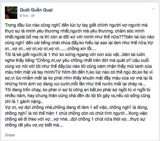 Chồng là Cao Xuân Quát sinh năm 90 mới tốt nghiệp ĐH có tiếng (Nghe đồn là ĐH Bách Khoa) còn vợ là Nguyễn Thị Ngọc Ánh Trang cũng sinh năm 90 vừa tốt nghiệp kế toán. Hai người cưới nhau một năm rồi, đã có một đứa con trông rất kháu khỉnh. Ngày 19/12, hai vợ chồng cãi nhau to. Đến chiều cùng ngày, người nhà phát hiện chị Trang đã tử vong trên sàn nhà, bên cạnh là chiếc ghế gỗ có nhiều vết máu. Hiện anh Quát đang là nghi phạm gây ra cái chết của vợ và đang bỏ trốn. Vậy mà còn lên facebook bày tỏ nỗi niềm như thế này đây. Đọc những dòng này chắc ai cũng nghĩ chồng giết vợ rồi. Nghe giống như tự thú thế còn gì nữa.
