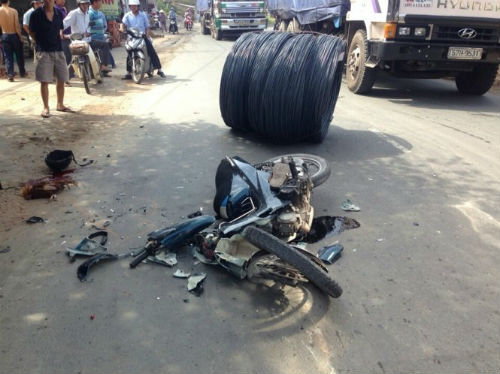 Khi đến gần khu vực ngã ba đường Nguyễn Duy Trinh - Tam Đa, một cuộn thép từ trên rơ mooc bất ngờ rơi xuống đường đè trúng xe máy, trên xe có 2 người đàn ông.