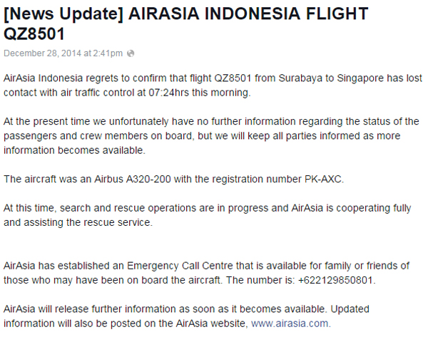 10h40 (giờ HN): Hãng AirAsia xác nhận máy bay mất tích trên Facebook, cho biết chưa có thông tin gì mới về tình hình các hành khách.
