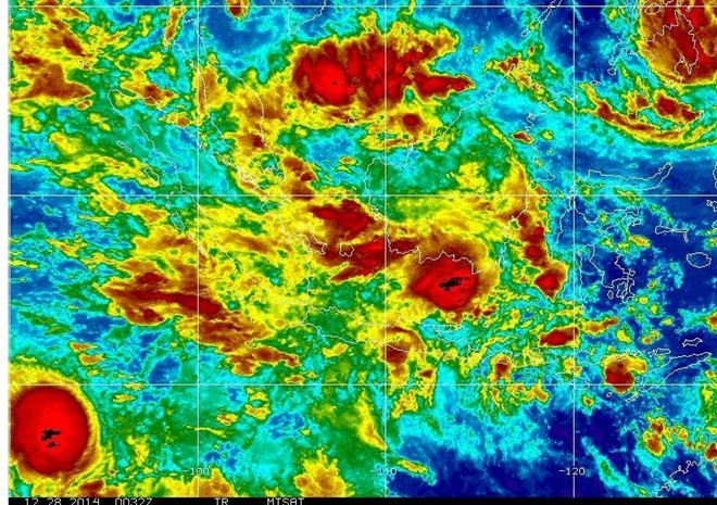 Ảnh vệ tinh đăng tải trên Twitter cho thấy các cơn giông bão đang phát triển mạnh (màu đen) về phía bắc thành phố Surabaya, Indonesia, nơi xuất phát của chuyến bay QZ 8501. Ảnh: Twitter