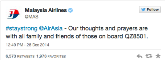 Hãng hàng không Malaysia Airlines, nạn nhân của hai vụ rơi máy bay chấn động trong năm nay, cũng đã bày tỏ sự thương tiếc trên trang Twitter chính thức của mình: “Hãy vững vàng lên AirAsia – Tất cả suy nghĩ và những lời nguyện cầu của chúng tôi đều hướng đến gia đình và bạn bè của những người trên chuyến bay QZ8501”.
