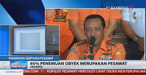 Bambang Sulistyo, người đứng đầu Basarnas, cho biết vào lúc 12h50 (giờ địa phương), phi cơ Hercules của không quân Indonesia phát hiện một vùng tối dưới mặt biển được cho là có h́nh dạng một phi cơ.